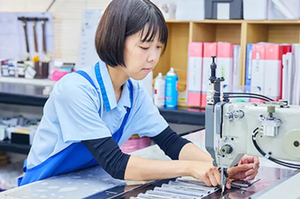 工場では、スタッフが「裁断」「部材作製」「パーツ作製」「組み⽴て「仕上げ」と⼤きく5つのパートに分かれ、様々なミシンや機材、道具と技術を⽤いてランドセルを製作しています。